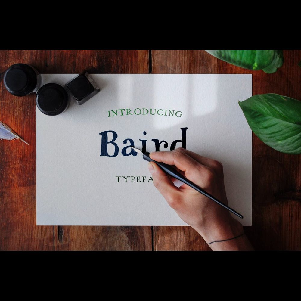 Baird is a hand-sketched font lovingly sketched serif font, creatively elegant and eccentric. Used extensively in Wedding Designs with all its imperfections and original unfinished edge makes a bold statement on anything from greeting cards and invitations, to personalized logos and handwritten quotes.