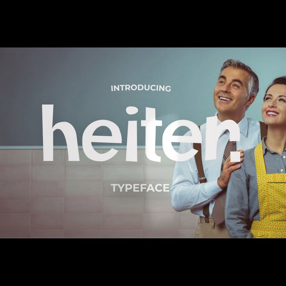 Heiter is a quirky Retro 1950s mid-century style fun hand drawn sans serif font with a classic 1950’s feel. Fun, jaunty and quirky in its hand drawn uneven feel, it is a versatile font with lots of uses. Great at large sizes on posters and in print, and for use as headings, banners, labels and for a bold statement.